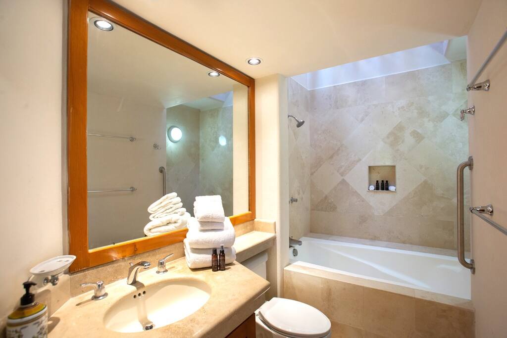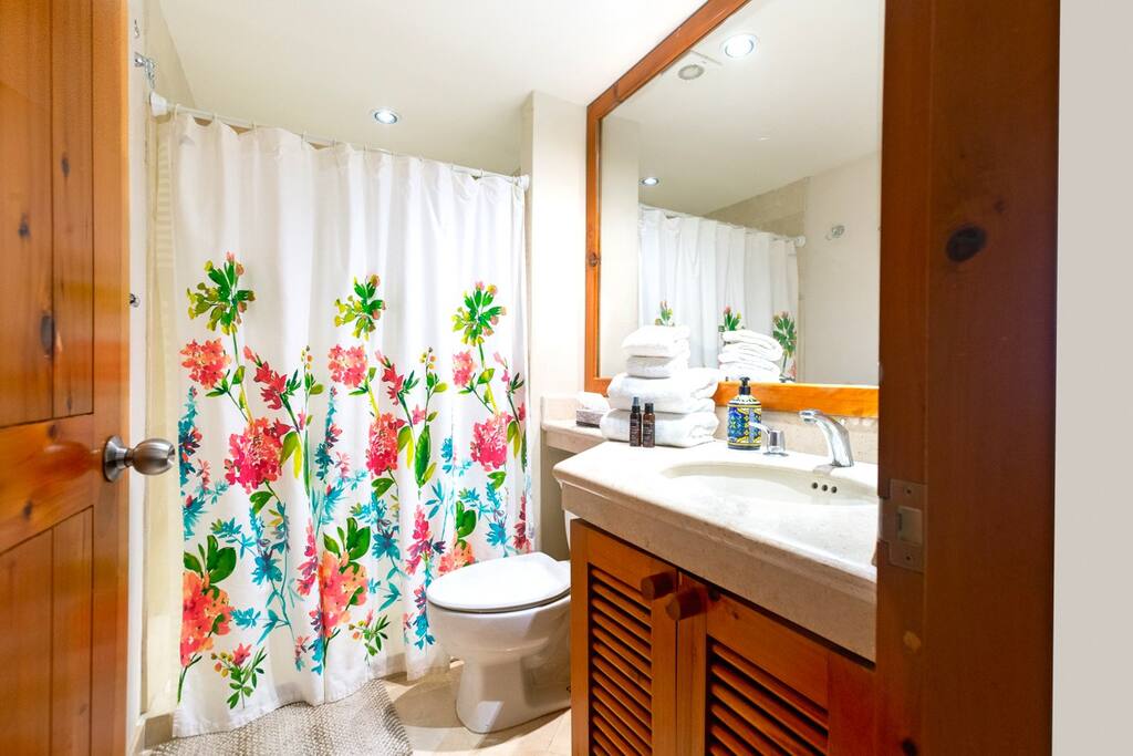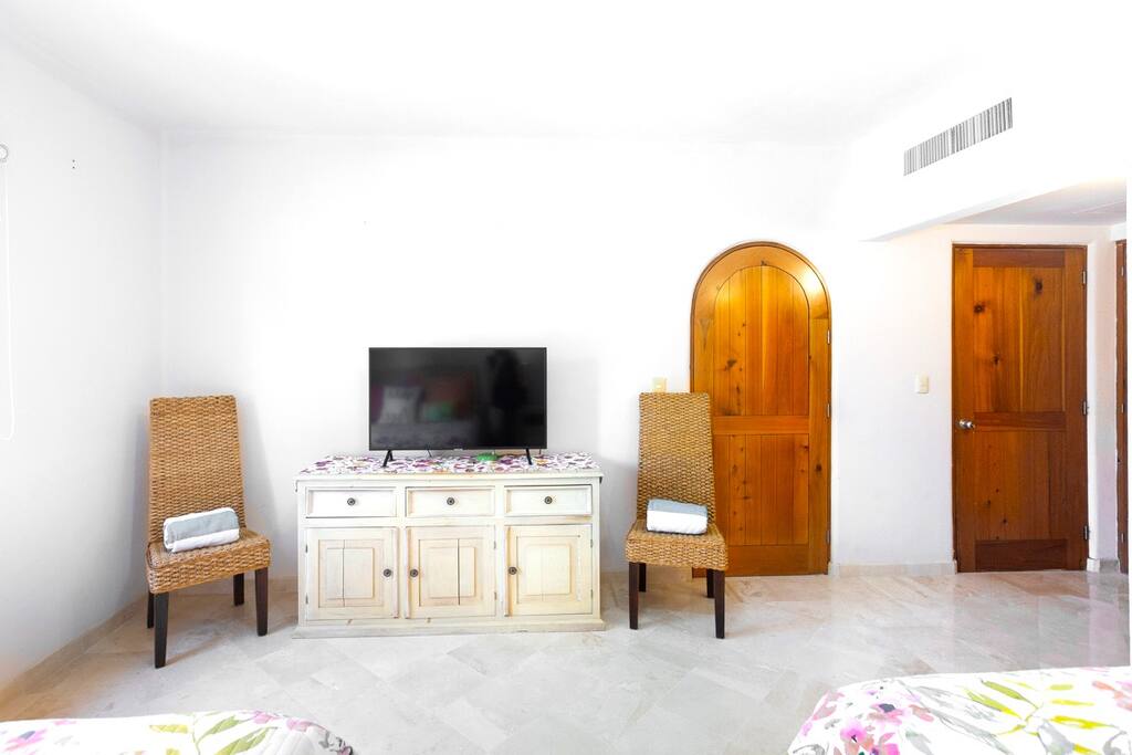 Casa Lulu features two spacious bedrooms. The master bedroom has a king-size bed, a large private bath with a shower/soaking tub, and a dressing area. The guest bedroom offers two queen-size beds and an en-suite bath with a walk-in shower. Both bedrooms are equipped with flat-screen Smart TVs, satellite service, blackout curtains, ceiling fans, and individual mini-split zone-controlled A/C units. The condo accommodates up to six guests.