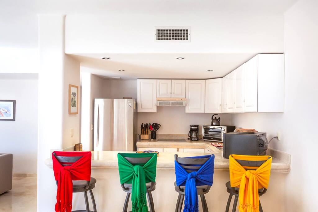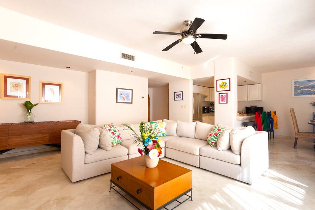 Step out to the Villas del Mar private beach area equipped with lounge chairs. The condo’s spacious ocean-view living area and large windows provide stunning views of the sparkling sea, enhancing the tranquil atmosphere.