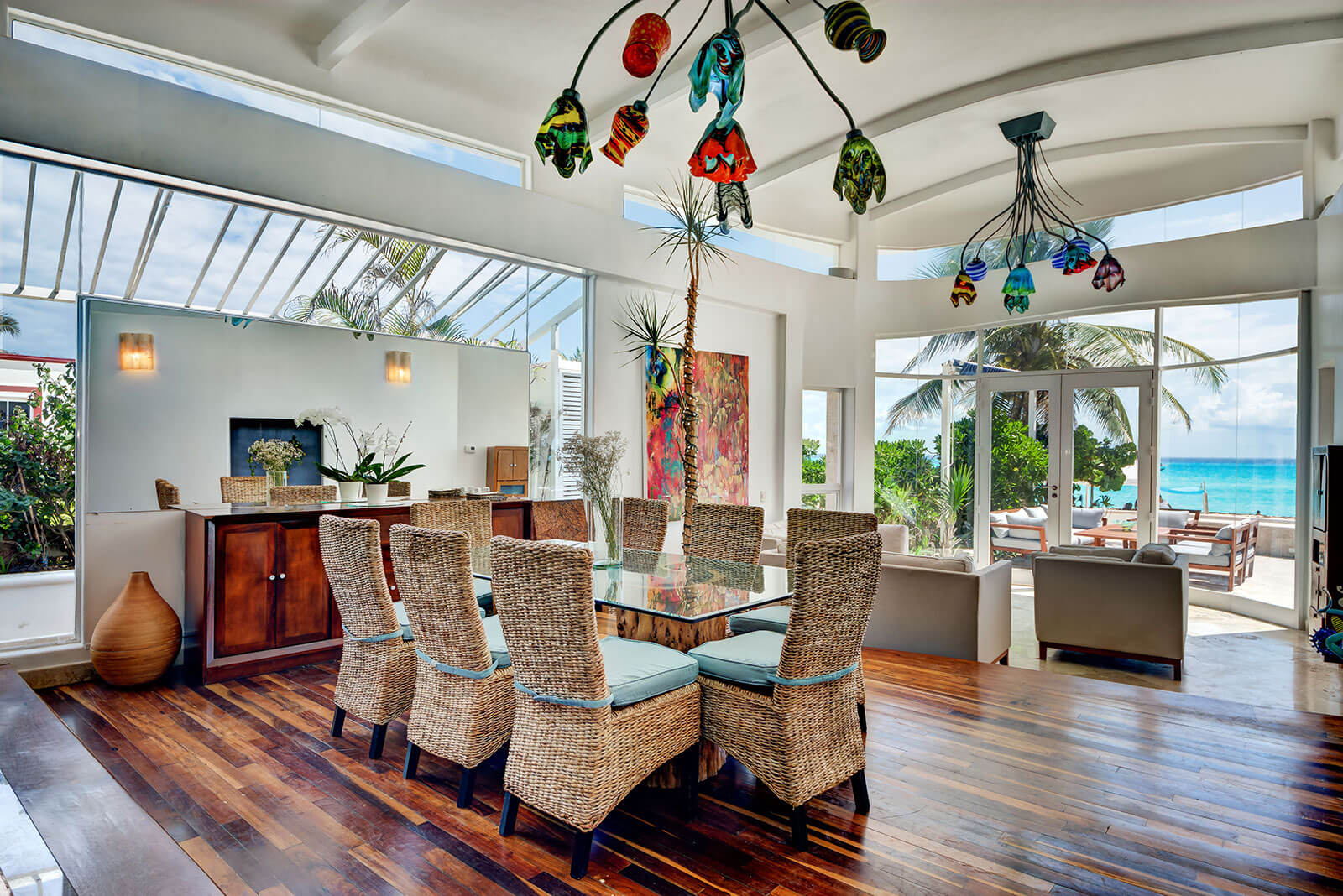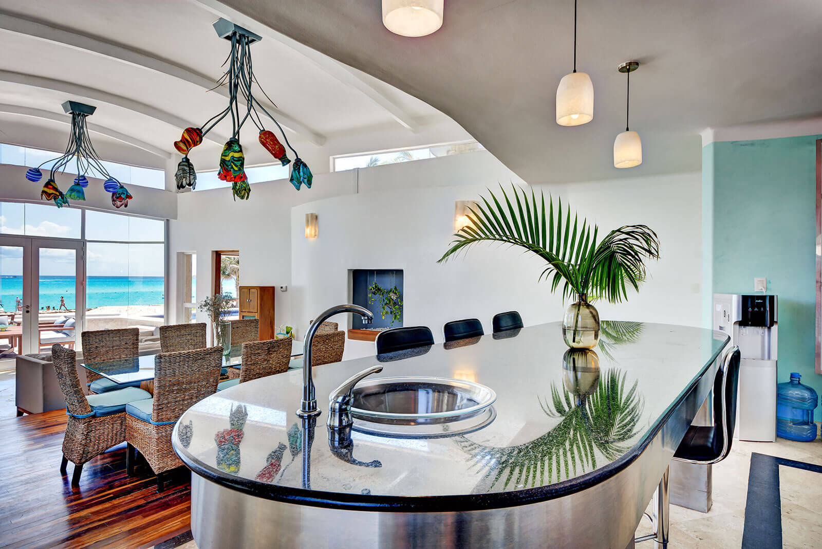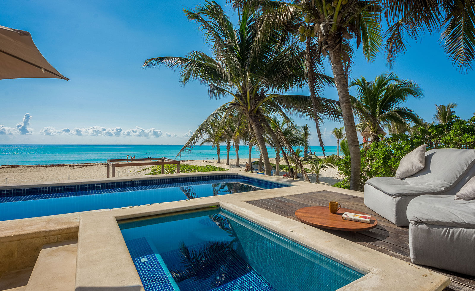 Beach House, a luxurious, stylish and contemporary 4 bedroom private villa is located in prime position on the beachfront of the exclusive gated community of Playacar Phase 1. Blissful beachfront relaxation awaits you….step from the villa onto the soft white sands of one of the worlds finest beaches, where kayaking, Paddle Boarding and snorkeling is incredible.