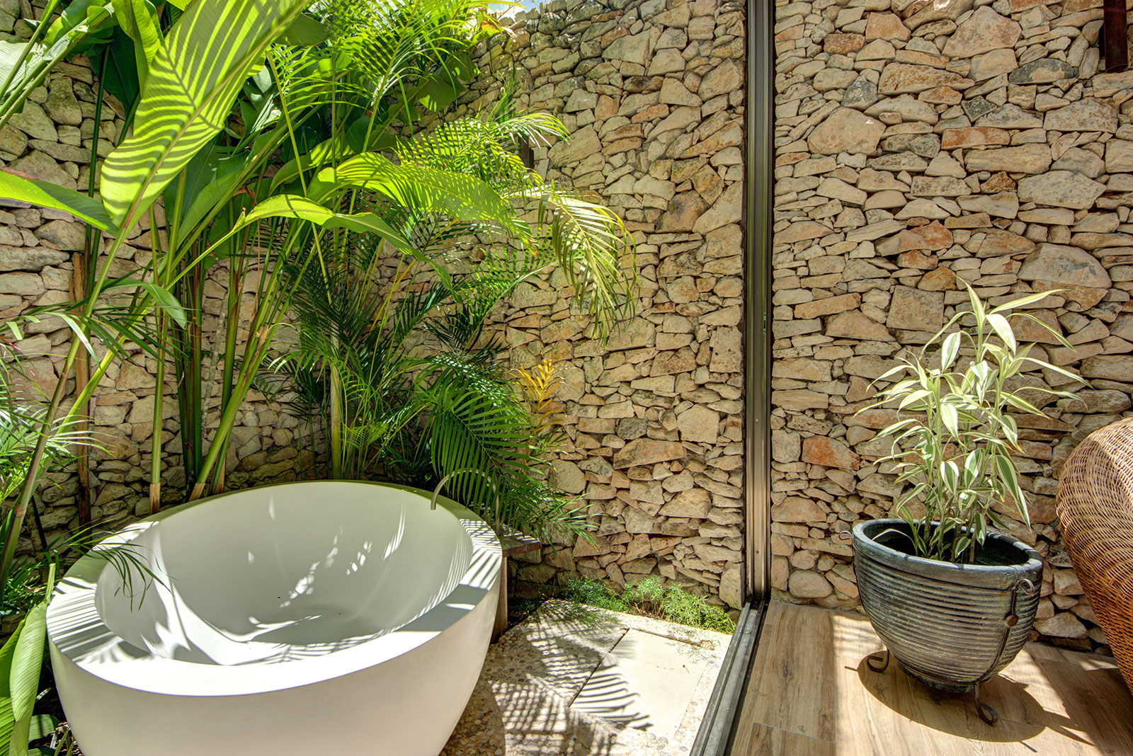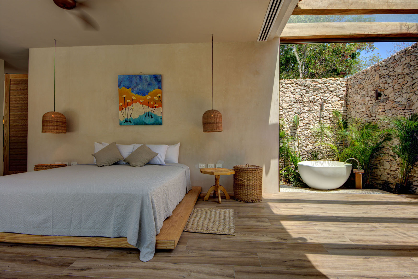 There is a beautiful connection between the indoors and the outdoors. The living area fully opens to the pool. The master bathroom has an open air bathtub in the garden – soak and watch the stars. The open rooftop is the ultimate sunset spot with jungle views.